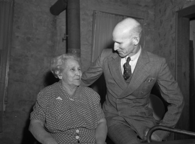 Brigadier General William Hood Simpson is being transferred to Camp Wolters in Mineral Wells, Texas where he will serve as commanding officer of the camp. He is shown posing with his mother, eighty-three-year-old mother, Mrs. Elizabeth Simpson. They are catching-up in the ranch house where General Simpson was raised. Mrs. Simpson is wearing a polka-dot dress. General Simpson is dressed in a double breasted three piece suit. Published in Fort Worth Star-Telegram, morning edition, March 23, 1941.