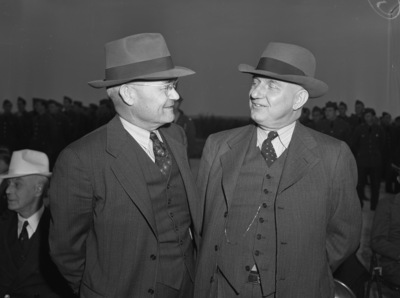 A crowd is gathering at Camp Wolters in Mineral Wells, Texas as the camp officially passes to the Army. Left to right are A. P. Rollins and F. M. Reeves. Both men spoke at the ceremony. Mr. Rollins is a architect- engineer for the camp. He is wearing a hat and a pinstripe three piece suit. Mr. Reeves, a contractor, is dressed in a hat and a three piece suit. Published in Fort Worth Star-Telegram, morning edition, March 23, 1941.
