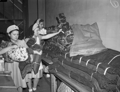 Young Red Cross workers at the Tarrant County Chapter of the American Red Cross (left to right) Joan Griffin, Lucy Owings, and Betty Schoonover work with cut material that will be sewn into women and girl's skirts and dresses. There are cut fabric bound and piled on the tables. When completed, the garments will be shipped to the Women's Voluntary Auxiliary in London. Published in the Fort Worth Star-Telegram morning edition, March 23, 1941.