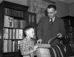 John Louis Merrill and his father, L. P. Merrill, looking at a collection of cowboy literature.