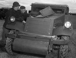 The photograph shows Glenn L. Durst, left, and Bruce Eberhart, cleaning the motor of one of the cavalry regiment's scout cars.