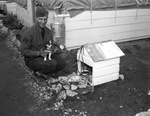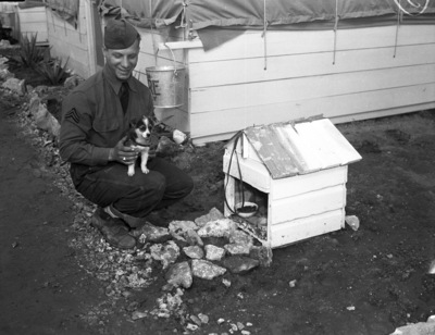 United States Army Corporal Dale German with "Dallas," the camp mascot.