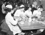 Army nurses at Camp Bowie eat breakfast together in the nurses' mess hall. Seated at the dining table in the foreground are, left to right, Rebecca Schmid, of San Antonio, Texas, Josephine Lucas, of Houston, Texas, Mary Lou Laager, of San Antonio, Texas, and Helen Painter, of Harlan, Kentucky. They are all wearing nurse uniforms. On the table are several cups, plates and bowls. Sitting in the background are more nurses.