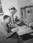 On duty in her ward at 7:00 a.m., reserve Army nurse Helen Painter consults charts and records with Lieutenant Howard Dudgeon, of Waco, Texas, medical officer. Nurse Painter is standing beside a desk, wearing her uniform. Lieutenant Dudgeon is sitting at the desk, holding a sheet of paper and wearing his military uniform. On the desk are various documents, jars of ink, a telephone and a filing cabinet.