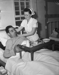 Helen Painter, Army nurse at Camp Bowie, attending to a patient from Fort Worth, Texas. The patient, Herbert R. Patrick, of the Headquarters Battery, 133rd Field Artillery, was in an automobile accident on February 23, 1941. He is lying in a hospital bed with a tray of food over his lap.