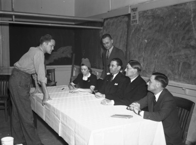 The Selective Service Board Number Three is giving a demonstration on how the board operates at Texas Christian University (TCU). Robert H. Bunnell Junior, is being interviewed concerning his questionnaire during a meeting of the TCU Chamber of Commerce. The board officials are left to right Miss Gwynne William, V. A. Leonard (standing), E. L. Gilbert, Brown Harwood, and John Stanley. Mr. Bunnell is wearing a striped shirt, necktie, and tweed trousers. Miss William is the stenographer. She is wearing her hair in a scarf and a dress with lace around the collar. Mr. Leonard, clerk, is dressed in a suit. Mr. Gilbert, board member is wearing a pinstripe suit with a pocket square. Mr. Harwood is the chairman. He is wearing a dark suit. Mr. Stanley is the board secretary. He is dressed in striped suit. The board members are sitting at a table. A chalkboard is hanging along the wall. Published Fort Worth Star-Telegram Morning Edition March 25, 1941.