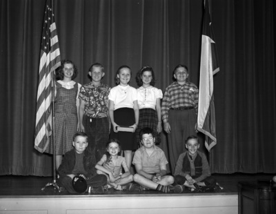 South Hi-Mount School "Button Brigade", pupils collecting buttons for garments being done by the Fort Worth branch of the British War Relief Society. These students pose with big smiles on the stage between the American and Texas flags. Standing left to right: Annette Wood, Barney Cargile, Mary Barcus, Paula McDaniel, Allen Mount, (seated. left to right) Billy Koltoff, Jan Stanford, Curtis Weeks and Holt Hickman. Published in the Fort Worth Star-Telegram evening edition, March 26, 1941.