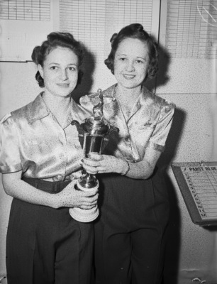 Winners in the Texas Women's Bowling Association tournament are left to right, Mary Potter and Stella Tavener. The Bowling Queens will officially receive their trophies Thursday during a ceremony. The women won the doubles category. Miss Potter is wearing a button-up blouse and trousers. Miss Tavener is dressed in an embroidered bowling shirt and trousers. They are posing with a bowling trophy.