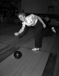 Mary Daunis was named Bowling Queen after winning the singles category in the Texas Women's Bowling Association tournament. Miss Daunis is shown rolling a bowling ball down the lane. She is standing on her left foot with her right in the air. She is dressed in a silk button-up blouse, trousers, and bowling shoes.