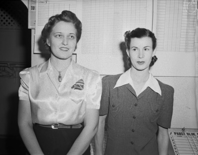 Winners in the Texas Women's Bowling Association tournament are left to right, Mary Daunis and Ruth Floyd. The Bowling Queens will officially receive their trophies Thursday during a ceremony. Miss Daunis won the singles category. She is wearing a silk blouse, trousers, and a bowling pin necklace. Miss Floyd won all-events. She is dressed in a button-up blouse.
