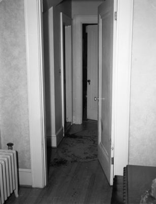 Image shows a interior shot of the hallway at D. H. Snyder home where Mrs. Snyder struggled with the assailant when he took her pistol and beat her. The house is a two-story brick building, with a Spanish clay tile roof. Published in the Fort Worth Star-Telegram evening edition January 29, 1940.