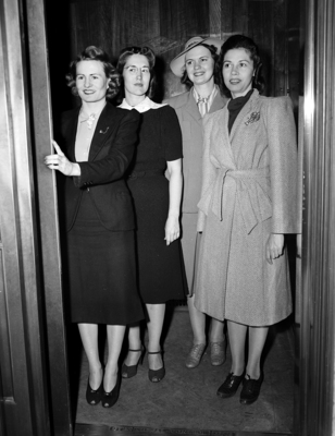 Four members of the Footlite Club cast of "The Little Prison," one-act play to be presented Thursday at 6:30 p.m. before the Wholesale Credit Men at Blackstone Hotel, are seen here in the setting for the comedy, a department store elevator. Left to right, Ruth Wiggins, Imogene Matthews, Mackeye Bob Hart and Isabel Robertson. All four women are seen standing side by side each other in a doorway. Published in Fort Worth Star-Telegram evening edition March 26, 1941.