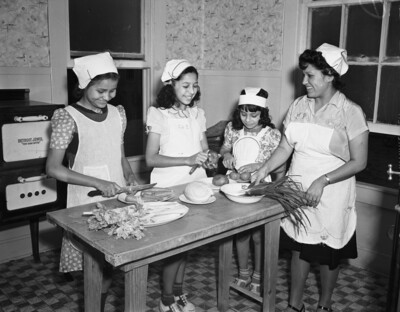 Girls at the Mexican Presbyterian Center learn how to prepare a vegetable salad in the kitchen at the new center quarters. Left to right, they are Leonor Ramirez, Elizabeth Walls, Betty Del Rio and Miss Juanita Fuentes, instructor. They are standing around a wooden table that has plates and different vegetables on it. Miss Ramirez and Miss Del Rio are holding knives and cutting up vegetables. Miss Walls is peeling a vegetable. All the girls and Miss Fuentes are wearing aprons and hats. Behind them, at left, is a Detroit Jewel brand oven.