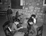 Boys at the Mexican Presbyterian Center play games in the basement of the building. In the foreground are Salvador Del Rio (left) and Eduardo Rodriguez. In the back are Luz Rodriguez (left) and Trinidad Garcia. The pairs of boys are sitting at tables, playing board games. Salvador and Eduardo are playing checkers and the other pair are playing a different game. Salvador is wearing a sweater and trousers. Sticking out of the back pocket of his pants is a rolled up paper. Eduardo is wearing a coat and trousers. Luz is wearing a coat, a hat and trousers. Trinidad is wearing a collared shirt and striped trousers. An unidentified young boy is standing in the background at the far left. He is wearing a leather jacket and trousers.