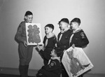 Chief Jerry Withers, far left, shows members of his den a Chinese kite, one of the prizes to be awarded at the kite carnival for Boy Scout Cubs at Rosemont Park. The scouts, standing, left to right, are Richard Massey, Charles A. Hamilton and Raymond Foster. Kneeling beside the kite to be entered in the contests is George Blazi. All boys are members of Troop 2, sponsored by Polytechnic Methodist Church. Raymond is holding another kite. All the boys are wearing their scout uniforms.