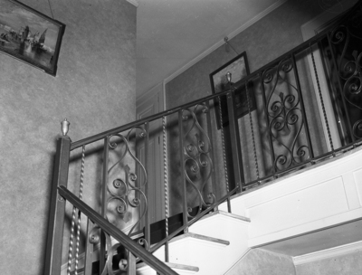 Image shows the top of the stairway at the D. H. Snyder home, where Mrs. Snyder was found in a dazed condition by the maid and chauffeur when they entered. The house is a two-story brick building, with a Spanish clay tile roof. Published in the Fort Worth Star-Telegram evening edition January 29, 1940.