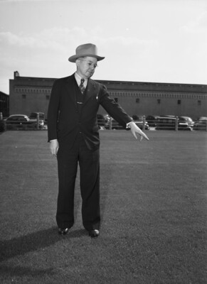 Houston Hutchens is director of the Fort Worth Chamber of Commerce and one of the leaders of the organization's annual membership and budget campaign drive. He is standing outside, pointing to the ground. He is wearing a three-piece suit, eyeglasses and a cowboy hat. Behind him are several parked cars in front of a building.