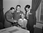 Mrs. V. E. Ashford of Houston, holding cards as they are studied by, left to right, Ben Fain, San Antonio, Texas; Paul Hodge and John Gerber, both of Houston at Texas State Bridge Tournament.