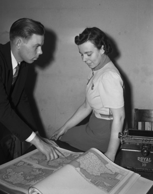 Reverend and Mrs. Seth Anderson are looking at a map of Europe, giving equal concern to the two wars. Reverend Anderson is a student at the Southwestern Theological Seminary. His father was born in Finland. He is pointing out the exact location of Finland's Aaland Islands, to one of which he is a partial heir. Mrs. Anderson's parents, brother, and sister live in Nottingham, England. Reverend Anderson is dressed in a suit. Mrs. Anderson is sitting on the edge of a desk, wearing a blouse and a skirt. There is a typewriter behind her.