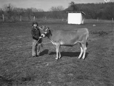 Wilmer Ray Fallin, 4-H Club boy of the Brazos Valley Club, with his Jersey heifer. Wilmer is standing in the middle of a field, holding the lead that is attached to his young cow. Wilmer is wearing a hat, trousers and a zipped up jacket. In the background is a small shed and the field is surrounded by a wire fence.