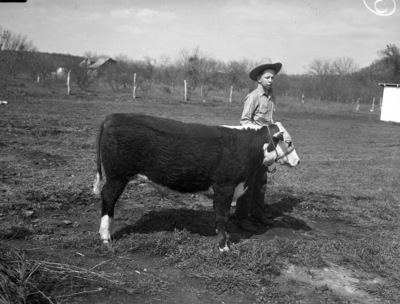 Kenneth Mitchell, 4-H Club boy of Strawn, Texas, with his baby beef. Kenneth is standing beside his young calf in the middle of a field. He is wearing a cowboy hat, a pair of boots, a buttoned-up shirt and trousers. In the distance, a small shed and a wire fence can be seen.
