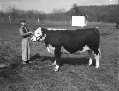 Donald Boone, 4-H Club boy of Palo Pinto, Texas, with his baby beef. Donald is standing in front his young calf in the middle of a field. He is wearing a hat, a collared shirt, and a pair of wide-legged trousers and is holding on to the lead that is attached to his cow. In the distance, a small shed and a wire fence can be seen.