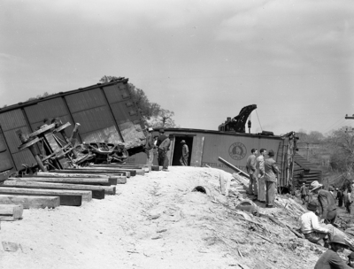 Image shows a freight train derailment on the Missouri-Kansas-Texas Railroad near Dale, Texas, in which two men were killed. One of the victims was tentatively identified as James P. Greer or James P. Gunn of Austin, Texas. The other was identified by a social security card as Tommy Eugene Wooderd, 26, of Greenbriar, Tennessee. Unidentified people are standing alongside the train and examining the wreckage. Published in the Fort Worth Star-Telegram morning edition March 29, 1941.