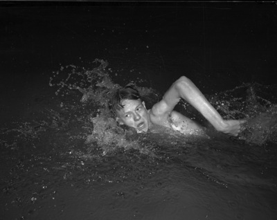 Jimmy Malone of the Arlington Heights High School participates in the Southwest Area Young Men's Christian Association swim meet, is displaying good form finishing second in the 100-yard free style event in the junior division.