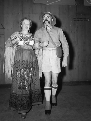 Some of these won prizes but all had a barrel of fun at the Advertising Club's first annual Whingding costume party in Pioneer Palace. Mr. and Mrs. Max Shippee. Mr. Shippee appears to be wearing an explorer costume and Mrs. Shippee is wearing what appears to be a folkloric dress with sequins. Published in the Fort Worth Star-Telegram evening edition, March 31, 1941.