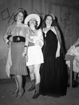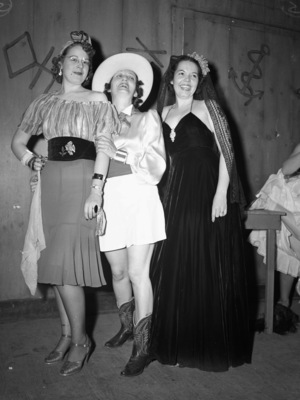 Some of these won prizes but all had a barrel of fun at the Advertising Club's first annual Whingding costume party in Pioneer Palace. Left to right, Miss Constance Howard, Miss Margaret Hall and Mrs. Virgil Segale. Mrs. Howard appears to be wearing a a dress that is below her knee, a hat, and eyeglasses. Miss Hall is wearing a cowgirl costume and Mrs. Segale is wearing a night gown and a flower in her hair. Published in the Fort Worth Star-Telegram evening edition, March 31, 1941.