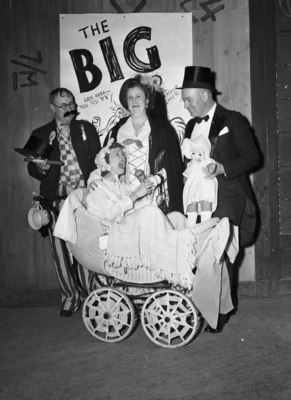 Four of the Advertising Club members and guests who joined in the fun at Pioneer Palace for the Whingding party which supplanted the annual gridiron affair. In the buggy is Mrs. Roy G. Tomlinson, who essayed the role of Baby Snooks. Standing, left to right, are Tomlinson, Mrs. Forrest C. Withers and Withers. There's a poster behind them. Published in the Fort Worth Star-Telegram morning edition, March 30, 1941.