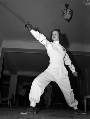 Miss Kathryn Douthit, Dallas, Texas, in action shot at Southwest Fencing Tournament.