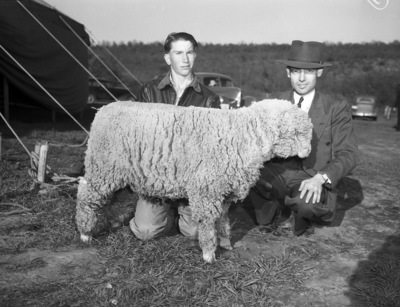 L. V. Anderson, left, who fed the grand champion lamb of the livestock show at Mineral Wells, Texas; at the right is Asher Cohen, owner of the Cinderalla Shop, who purchased the lamb for one dollar per pound. The two men are kneeling behind the lamb. Mr. Anderson is wearing a leather jacket and Mr. Cohen is wearing a brimmed hat and a suit. Behind them are ropes that are pitched to the ground by small wooden posts. These ropes are connected to a tented off area on the left of the scene. A few cars be seen parked near the tented off area, as well.