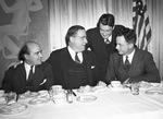 Speakers at the Fort Worth Jackson Day Dinner at the Blackstone Hotel included, left to right, Langford Carlton, Young Democratic Club leader; William McCraw of Dallas, Texas, principal speaker; Clyde Thomas, president of the club; and Ardell Young, toastmaster. The four men are all wearing suits. Mr. Carlton, Mr. McCraw and Mr. Young are sitting at a dining table, and Mr. Thomas is standing behind the table between Mr. McCraw and Mr. Young. On the table are dinner plates, glasses and cutlery. Behind Mr. Young is an American flag.