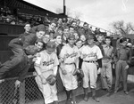 A group of soldiers from Camp Wolters came to show their support for the visiting Brooklyn Dodgers at LaGrave Field, in Fort Worth, Texas. The baseball players are, left to right, Pee Wee Reese, Cookie Lavagetto and Paul Waner. They are standing in front of the fence that separates the bleachers from the field. Behind them, in the stands, are the fans from Camp Wolters. The players are wearing their Dodgers uniforms, baseball caps and baseball gloves. The soldiers are all dressed in military uniform. A few other people can be seen seated in the stands behind the soldiers.