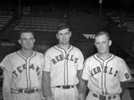 Dallas Rebels baseball players (left to right) Jack Sullivan, Frank Hargrove and Clyde Humphrey. The three men are standing next to each other in front of a section of bleachers. They are all wearing baseball uniforms. Hargrove's and Humphrey's jerseys say "Rebels," and Sullivan's jersey reads "Texans," across the chest.