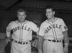 Dallas Rebels baseball players (left to right) John Stoneham and Al Weiland standing in front of a wire fence that separates the bleachers from the baseball field. They are both wearing their baseball uniforms which are striped and say "Rebels," across the front of the jerseys. Stoneham is also wearing a baseball glove on his left hand and is holding a baseball cap in his right hand.