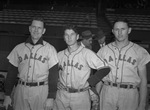 Dallas Rebels baseball players (left to right) Gordon Maltzberger, Bobby Dews and Heinz Becker standing in front of a wire fence that separates the bleachers from the baseball field. They are all wearing matching baseball uniforms; the jerseys have "Dallas," written across the front of them. Maltzberger and Dews are also wearing a dark, long-sleeve shirts under their jerseys. Standing behind the trio are two men wearing suits and hats.