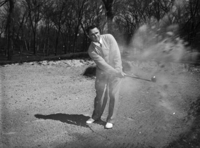 Larry Nabholtz playing golf at the Colonial Country Club in Fort Worth, Texas. He is standing in a sand trap and is swinging his ball out of it. This photograph was published in the April 1, 1941 evening edition of the Star-Telegram.