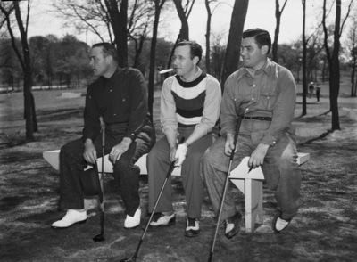 Colonial Country Club golf course "inspectors" include (left to right) Robert Plummer, George White and Reynolds Smith, all from Dallas, Texas. The men are seated on a bench at the golf course. Each is holding a golf club. Mr. White is smoking a pipe.