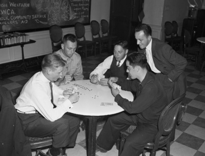 Soldiers form Camp Wolters made themselves at home at the new U. S. Army Recreation Center. It is located in the Colonial Room of the Hotel Texas. Four bridge players and a kibitzer of the 58th Training Battalion clockwise around the table are August Sticco, William Thompson, Aaron Silverstein, Isadore Sorkin, and Michele Rossi. Mr. Sticco, of Steubenville, Ohio, is dressed in a double breasted pinstripe suit. The blazer is hanging on the back of his chair, and he is smoking a cigarette. Mr. Thompson, of Akron, Ohio, is dressed in his military uniform. Mr. Silverstein, of Cleveland, Ohio, is wearing a dress shirt, necktie, and a sweater vest. Mr. Sorkin, of Cleveland, Ohio, is half standing and doing the kibitzing. He is dressed in a double breasted suit. Mr. Rossi, of Akron, Ohio, is wearing a button-up shirt and trousers. Published in Fort Worth Star-Telegram, morning edition, June 1, 1941.