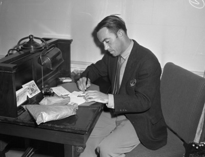 Making himself at home in the new U. S. Army Recreation Center is Private Daniel J. Kerr of Company B 60th Training Battalion at Camp Wolters. The Recreation Center is located in the Colonial Room of the Hotel Texas. Private Kerr is sitting at a desk, smoking a cigarette, and writing a letter to his family in New York City. He is dressed in a collared shirt, necktie, sports coat, and trousers. Published in Fort Worth Star-Telegram, morning edition, June 1, 1941.