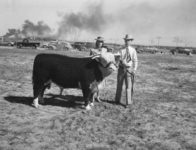 "Blanchard Return," reserve champion Hereford of the Sand Hills Stock Show. Shown in the picture, Mrs. George Nance of Canyon, left and Bud Minor, herdsman, at the halter.