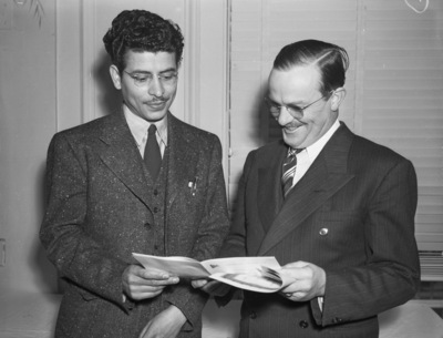 Achilles Ojeda Gonzales, left, of El Paso, Texas, and Arthur E. Carter, of Luling Texas, examining a program of the joint convention of the Southwestern Photographers Association and the Texas Professional Photographers Association (TPPA) which opened at Hotel Texas. Gonzales was the grand prize winner in the photo contest for association members, and Carter is a past president of the TPPA. Gonzales is wearing a dark three-piece suit and Carter is wearing a double-breasted suit with a striped tie. Both are also wearing eyeglasses. Behind them is a window with the blinds closed.