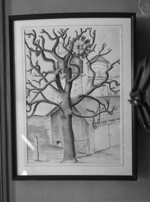 "Dead Tree," a water color by Norma Alice Adams, won honorable mention at the Fort Worth Art Association's exhibition, Fort Worth Local Artists Show. The painting depicts a large dead tree, gnarled and without leaves. Behind the tree is a fence, storage building , two water storage towers and a windmill.