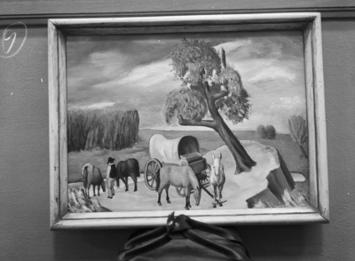 "The Horse Traders Camp," an oil painting by Douthitt Wilson. It was the third place winner at the Fort Worth Art Association's Local Artist Show. The painting depicts a rural scene with several horses, a man and a covered wagon. This photograph was published in the April 1, 1941 evening edition of the Star-Telegram.