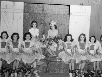 The 13th annual Panhandle Plains Dairy Show is being held in Plainview, Texas. The show exhibits both dairy cattle and dairy products and attracts crowds from all over the Plains country. Miss Jacquelyn Wilkinson, of Friona, Texas, is being crowned queen of the 1941 show. She is shown at the back right. At the left is her maid of honor, Miss Myrna Gaignat of Tahoka, Texas. In the front row, left to right, are Misses Frances Eiring, Ada Ruth Hilburn, Effie Jean Day, Bobby Lee Harris, Mona McCandless, and Katrina Keys. The girls are posing on bales of hay inside a barn, wearing matching dresses.