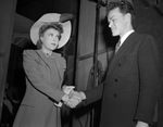 George D. Batson, playwright, shaking hands with the leading lady of his play "Treat Her Gently,", Ruth Chatterton. Mr. Batson is wearing a dark, double-breasted suit and Miss Chatterton is wearing her costume: a wide-brimmed hat adorned with a large feather, a long-sleeve dress and a coat. She is holding her gloves and purse in her other hand. Mr. Batson's play was performed at the Majestic Theatre in Fort Worth, Texas.