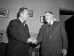 A nobleman of Khorassan was welcomed to the Azotos Temple, Dramatic Order of the Knights of Khorassan (D. O. K. K.), when the order held a regional meeting at the Pythian Castle Hall to honor Doctor Thomas E. Payne, right, imperial prince. Doctor Payne is being greeted by Clyde Mays, royal vizier of the Azotos Temple. The two men are standing in front of a wall, shaking hands. Doctor Payne is wearing a three-piece pinstripe suit and Mr. Mays is wearing a double-breasted suit. Doctor Payne is holding a cigar in his left hand. Behind Mr. Mays, at the far left, is an unnamed man who is seated on a bench and looking on.