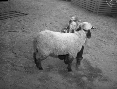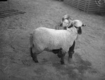 J. B. Copeland, 11, son of James M. Copeland of Las Cruces, New Mexico, and his prize winning lamb at the 1941 Southwestern Livestock Show at El Paso, Texas. J. B. is kneeling behind the lamb. He is wearing a long-sleeve, striped shirt and dark trousers. In the background, at the right, is a wooden fence.
